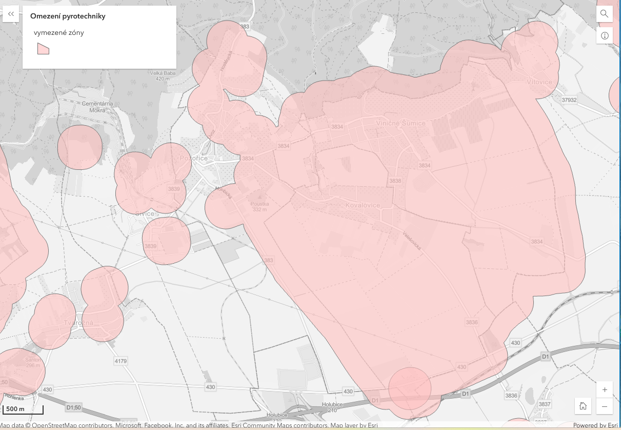 Přikládáme mapku zón v katastru a okolí obce Viničné Šumice, ve kterých je zakázáno zacházet s pyrotechnickými výrobky s výjimkou kategorie F1.